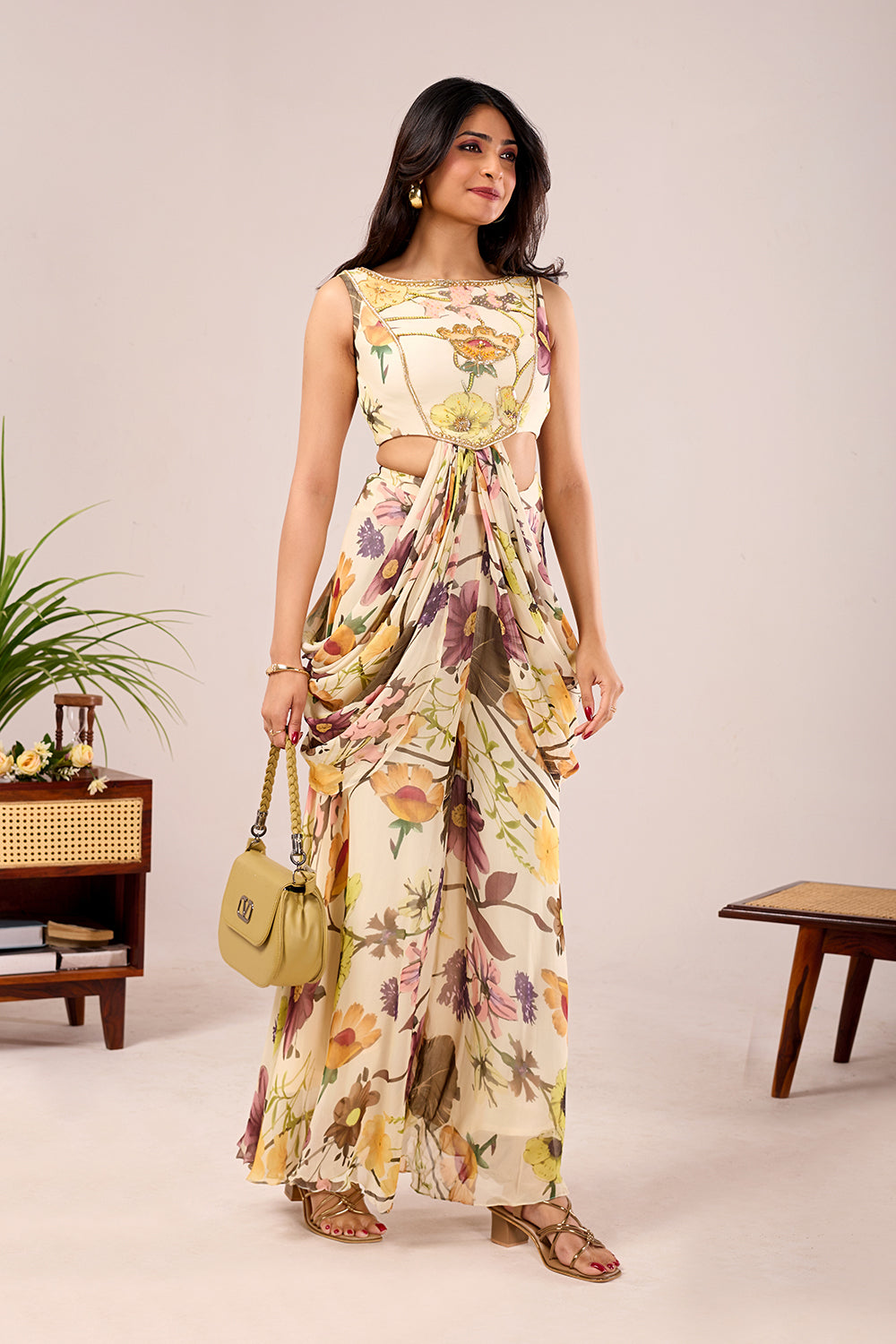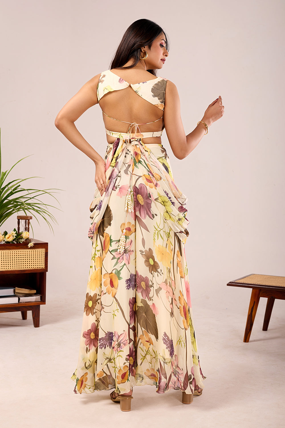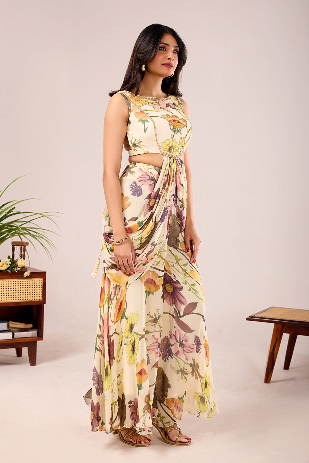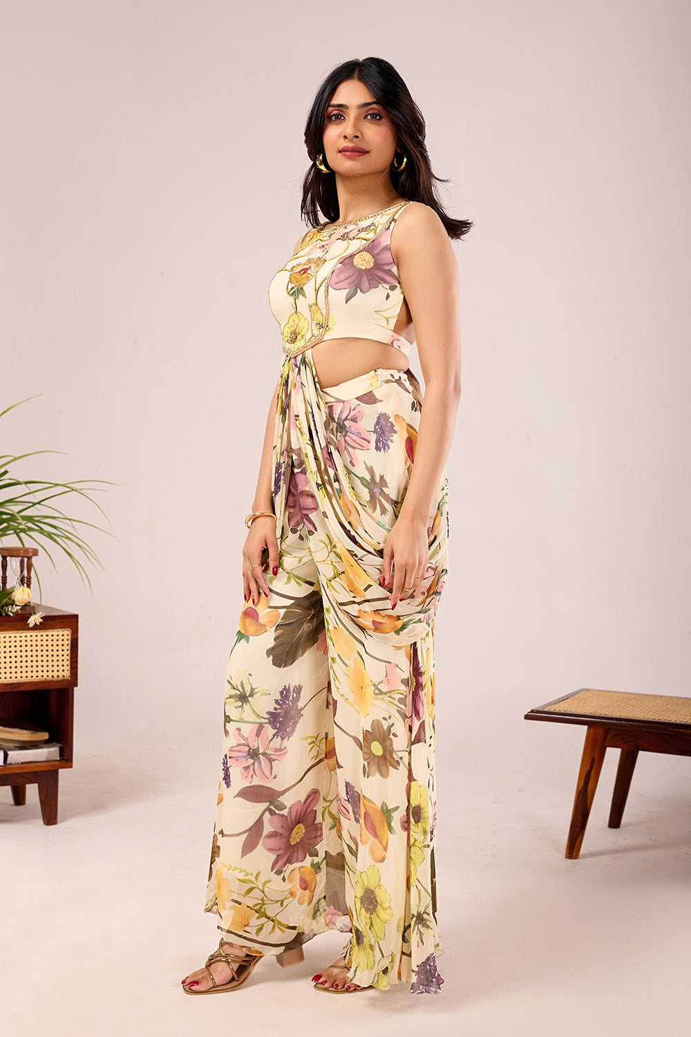 The Dori Iris Set is crafted in digitally printed viscose georgette with soft floral motifs on a fluid base. The set features a sleeveless sculpted blouse with delicate embellishment detailing and side cut-out design. It is paired with draped palazzo pants for a relaxed yet elegant silhouette.