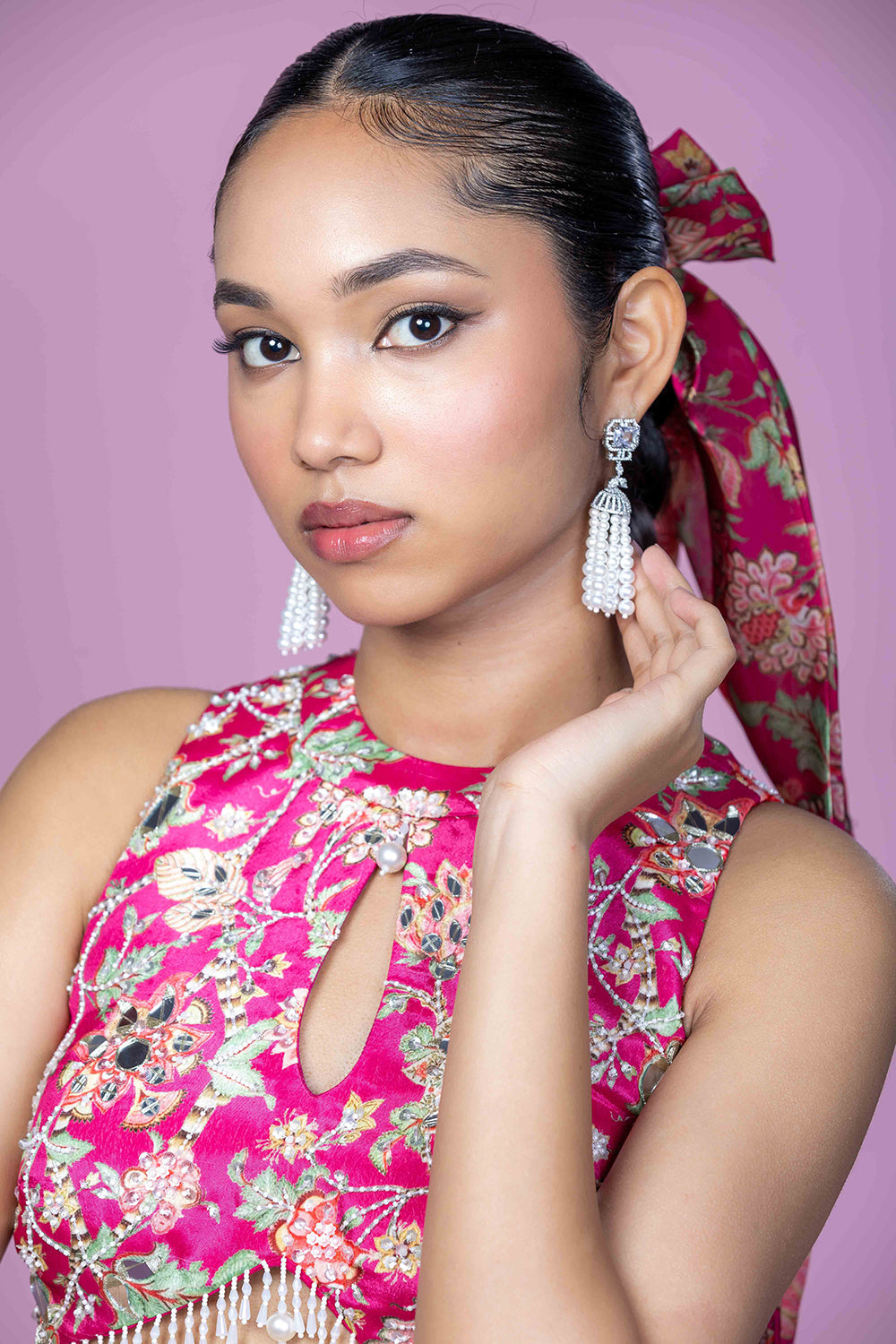 Step into the spotlight with Floral Fiesta, a vibrant and flirty lehenga set designed for the bold, festive spirit. This 3-piece ensemble features a sleeveless structured Chinon silk crop blouse in radiant fuschia pink, adorned with delicate threadwork, mirror embellishments, and a dramatic pearl-drop fringe hemline with fully lined and tailored with back zipper closures. The keyhole neckline and tailored back zip add structure and charm, while the handcrafted matching hair tie bow elevates the styling quotient. The look is completed with a voluminous flared lehenga skirt in matching floral Jimi Choo sheer flowy fabric and a light weight flowy solid georgette dupatta edged with gota lace—designed to twirl, dazzle, and celebrate. Perfect for festive days and glamorous nights, this ensemble captures the very essence of playful elegance.