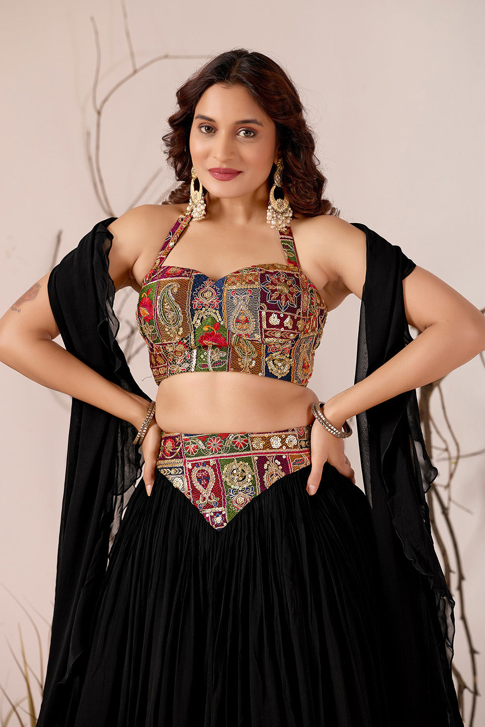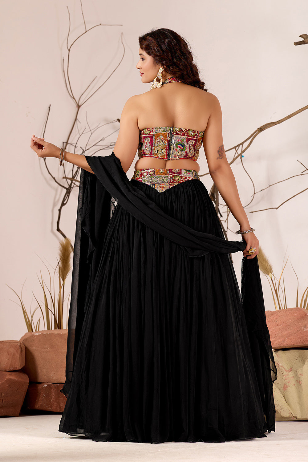 The skirt cascades in layers of soft black georgette, offering both volume and effortless movement. The high waistband mirrors the embroidery of the bustier, creating a seamless transition between the two pieces and highlighting the natural waistline. Paired with a lightweight georgette dupatta, this ensemble balances contemporary boldness with ethnic nostalgia - a poetic ode to artisanal luxury.